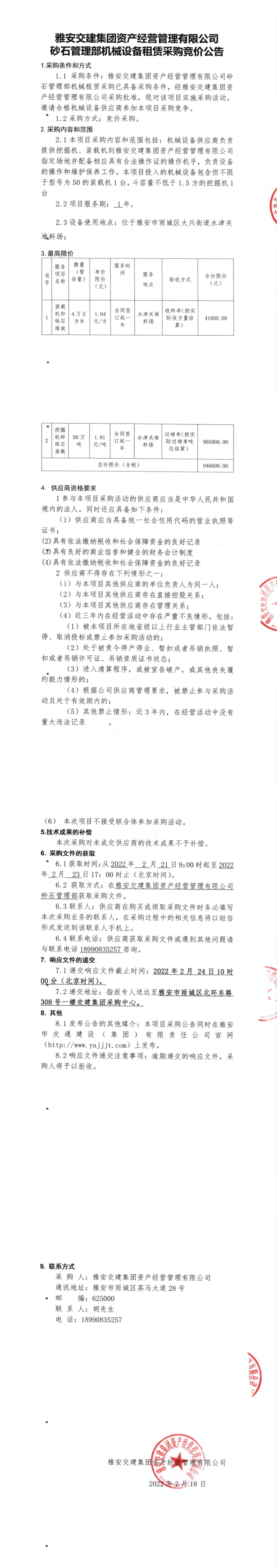 雅安交建集團資產(chǎn)經(jīng)營管理有限公司砂石管理部機械設備租賃采購競價公告