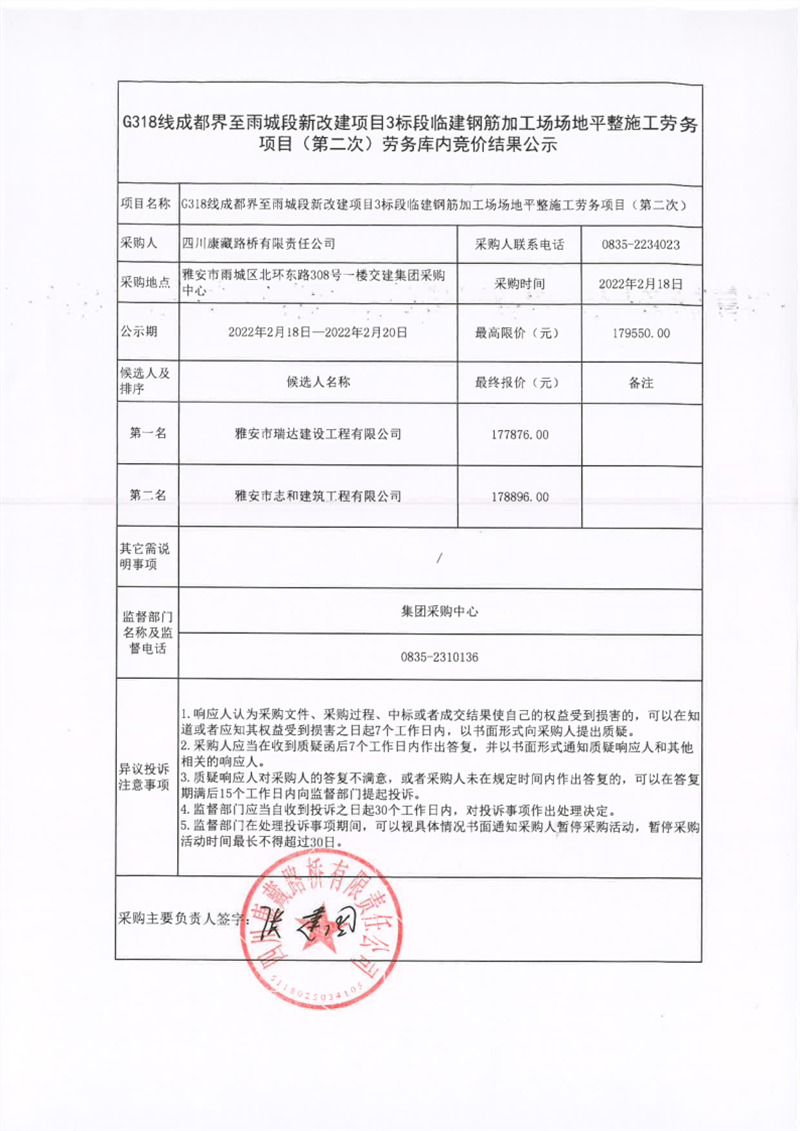 四川康藏路橋有限責(zé)任公司G318線成都界至雨城段新改建項目3標(biāo)段鋼筋加工場場地硬化施工勞務(wù)庫內(nèi)競價結(jié)果公示