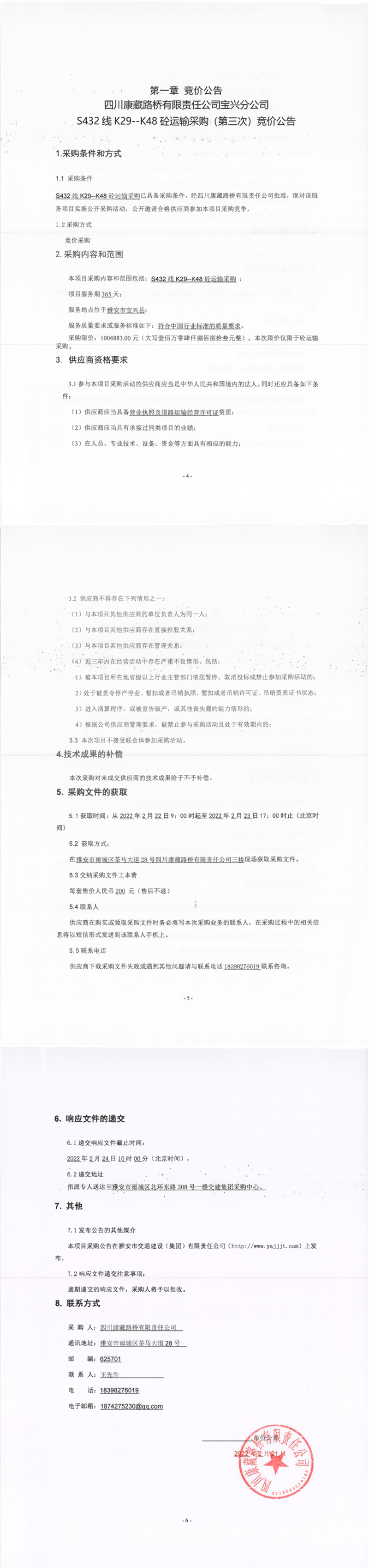 四川康藏路橋有限責(zé)任公司寶興分公司S432線K29-K48砼運(yùn)輸采購(gòu)(第三次)競(jìng)價(jià)公告