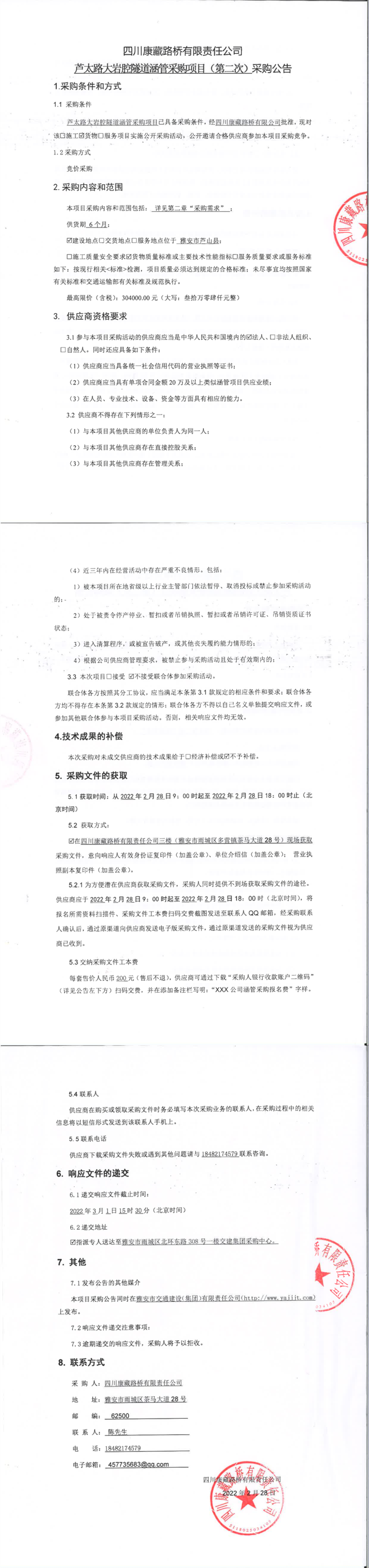 四川康藏路橋有限責任公司蘆太路大巖腔隧道涵管采購項目(第二次)采購公告