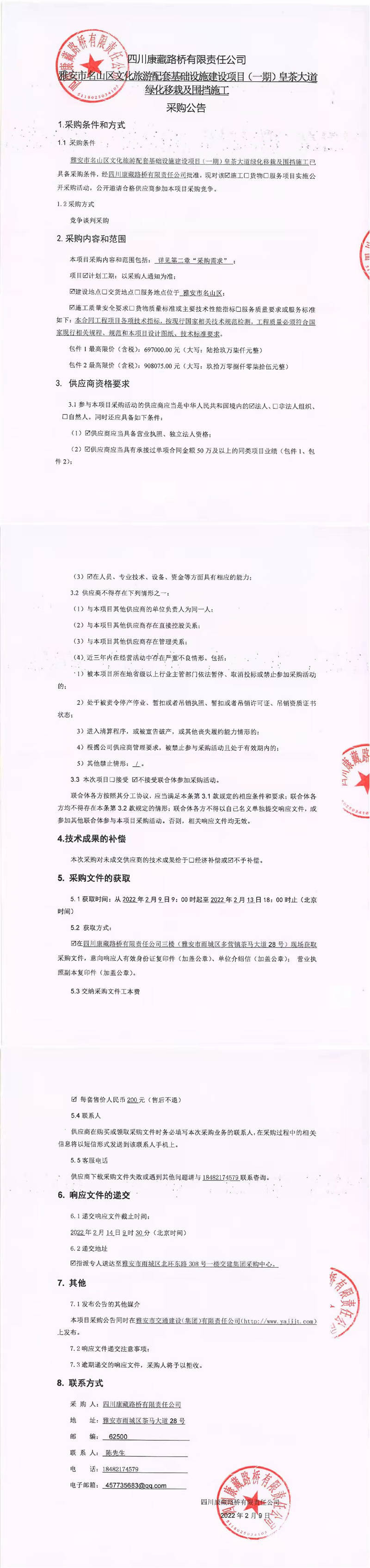 四川康藏路橋有限責任公司雅安市名山區(qū)文化旅游配套基礎設施建設項目(一期)皇茶大道綠化移栽及圍擋施工采購公告