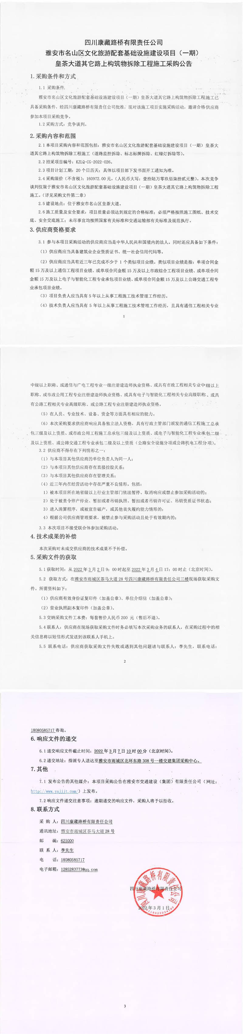 四川康藏路橋有限責任公司雅安市名山區(qū)文化旅游配套基礎(chǔ)設(shè)施建設(shè)項目(一期)皇茶大道其它路上構(gòu)筑物拆除工程施工采購公告