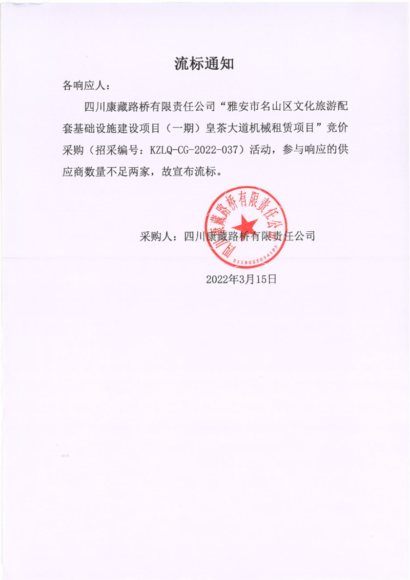 四川康藏路橋有限責任公司雅安市名山區(qū)文化旅游配套基礎設施建設項目(一期)皇茶大道機械租賃項目流標通知