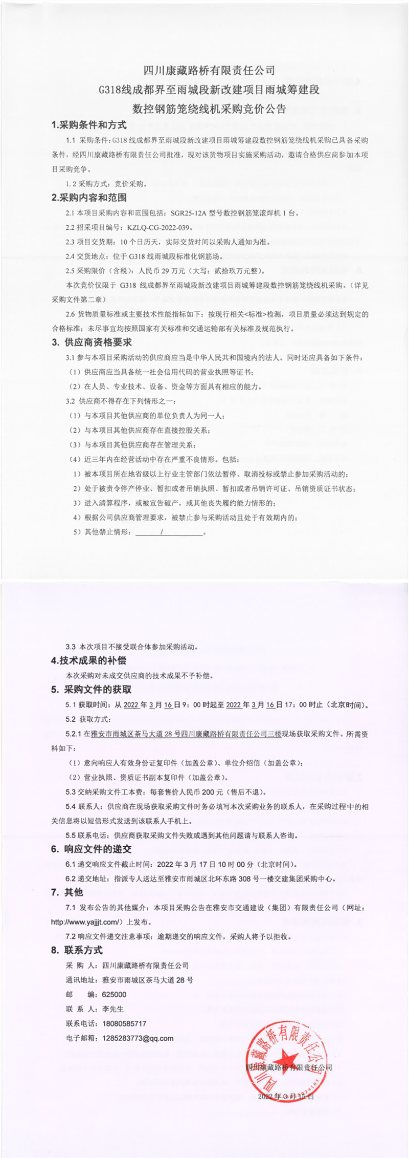 四川康藏路橋有限責(zé)任公司G318線成都界至雨城段新改建項目雨城籌建段數(shù)控鋼筋籠繞線機(jī)采購競價公告