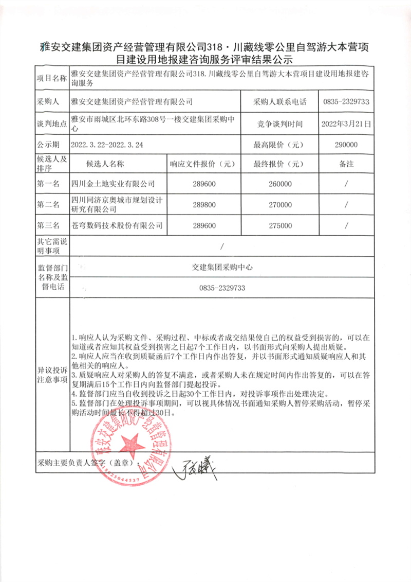雅安交建集團資產(chǎn)經(jīng)營管理有限公司318川藏線零公里自駕游大本營項目建設用地報建咨詢服務評審結果公示