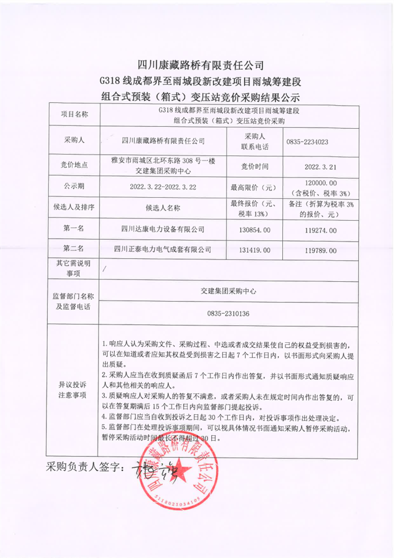 四川康藏路橋有限責(zé)任公司G318線成都界至雨城段新改建項(xiàng)目雨城籌建段組合式預(yù)裝(箱式)變壓站競(jìng)價(jià)采購結(jié)果公示