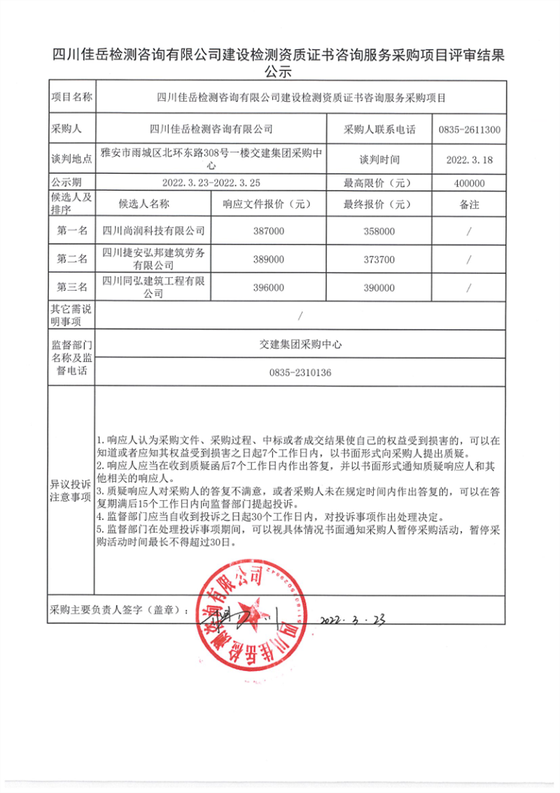 四川佳岳檢測咨詢有限公司建設(shè)檢測資質(zhì)證書咨詢服務(wù)采購項(xiàng)目評(píng)審結(jié)果公示