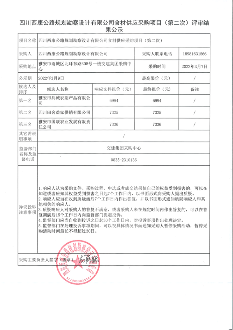 四川西康公路規(guī)劃勘察設(shè)計(jì)有限公司食材供應(yīng)采購項(xiàng)目(第二次)評(píng)審結(jié)果公示
