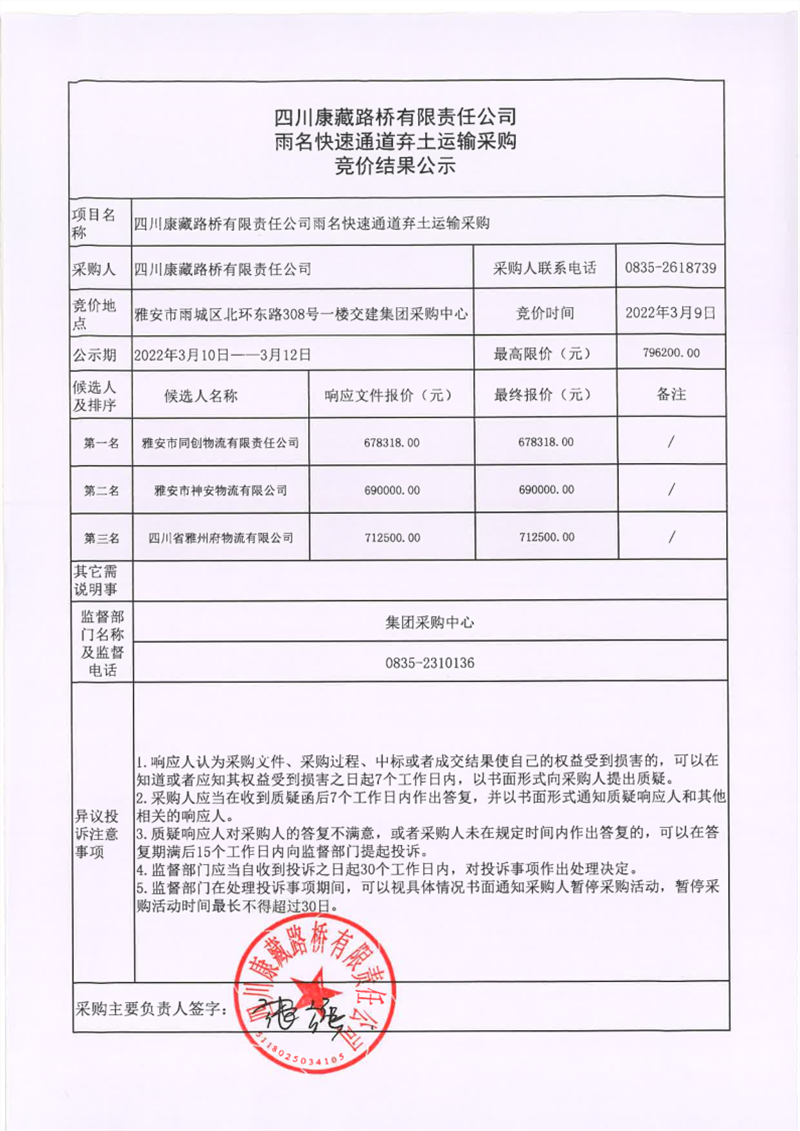 四川康藏路橋有限責(zé)任公司雨名快速通道棄土運輸采購競價結(jié)果公示