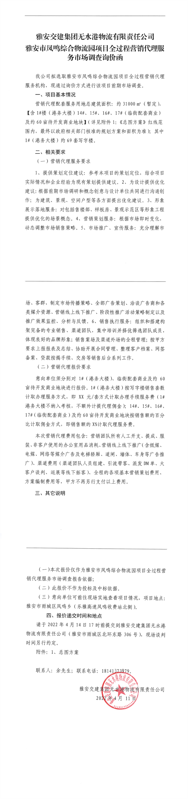 雅安交建集團(tuán)無(wú)水港物流有限責(zé)任公司雅安市鳳鳴綜合物流園項(xiàng)目全過(guò)程營(yíng)銷代理服務(wù)市場(chǎng)調(diào)查詢價(jià)函