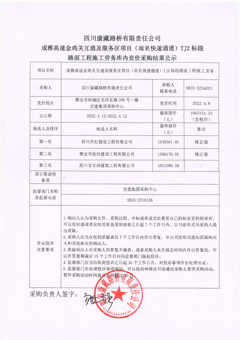 四川康藏路橋有限責任公司成雅高速金雞關互通及服務區(qū)項目(雨名快速通道)TJ2標段路面工程施工勞務庫內(nèi)競價采購結果公示