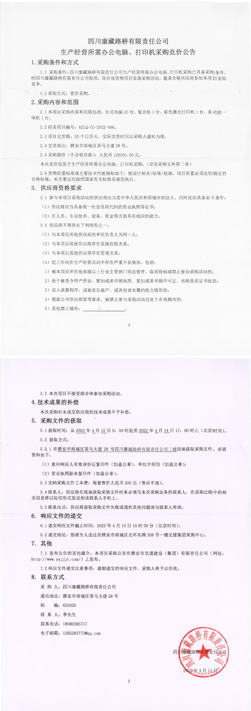 四川康藏路橋有限責(zé)任公司生產(chǎn)經(jīng)營(yíng)所需辦公電腦、打印機(jī)采購(gòu)競(jìng)價(jià)公告