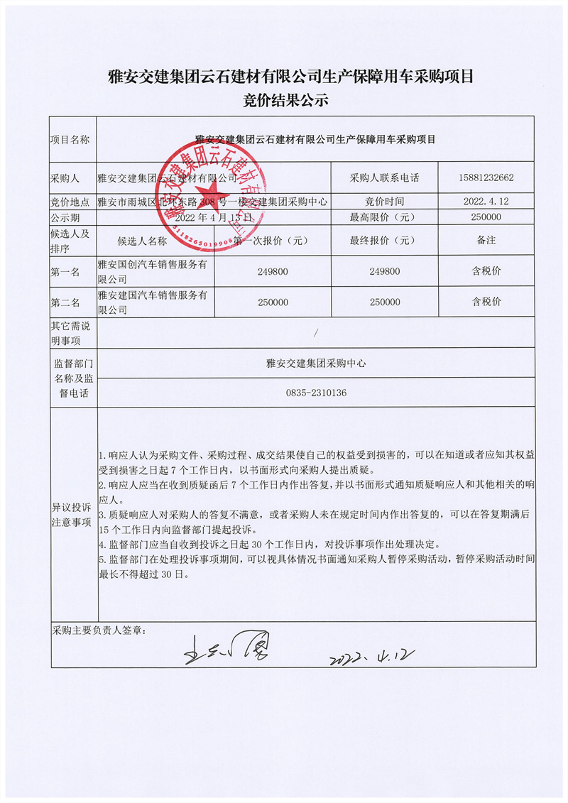 雅安交建集團(tuán)云石建材有限公司生產(chǎn)保障用車采購項目競價結(jié)果公示