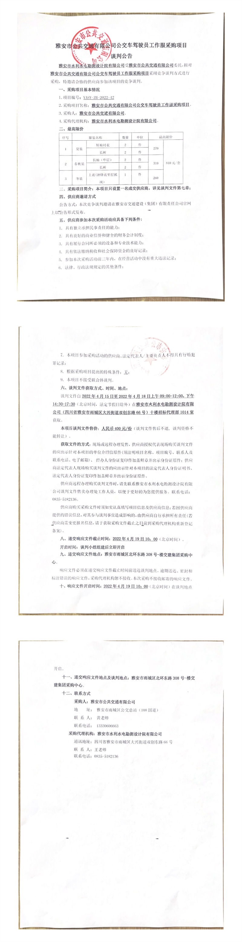 雅安市公共交通有限公司公交車駕駛員工作服采購項(xiàng)目談判公告