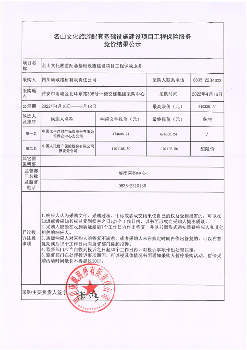 四川康藏路橋有限責任公司名山文化旅游配套基礎(chǔ)設(shè)施建設(shè)項目工程保險服務(wù)競價結(jié)果公示