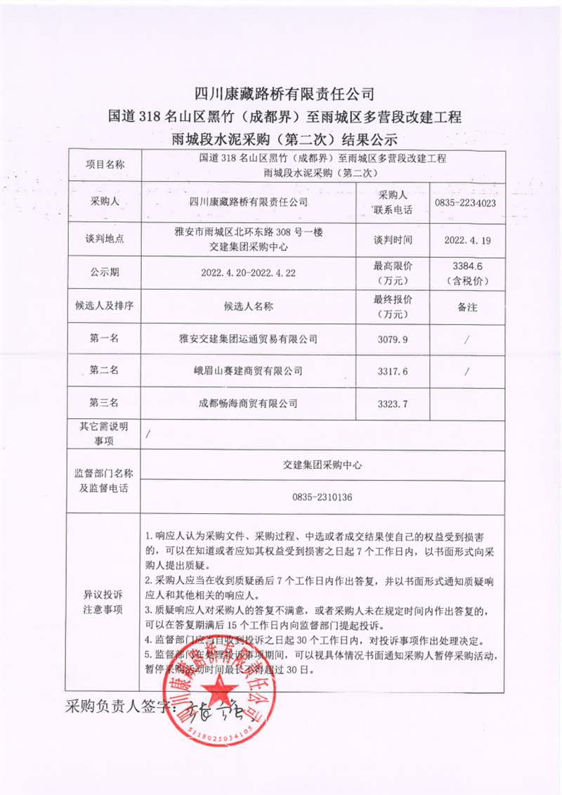 四川康藏路橋有限責(zé)任公司國道318名山區(qū)黑竹(成都界)至雨城區(qū)多營段改建工程雨城段水泥采購(第二次)結(jié)果公示