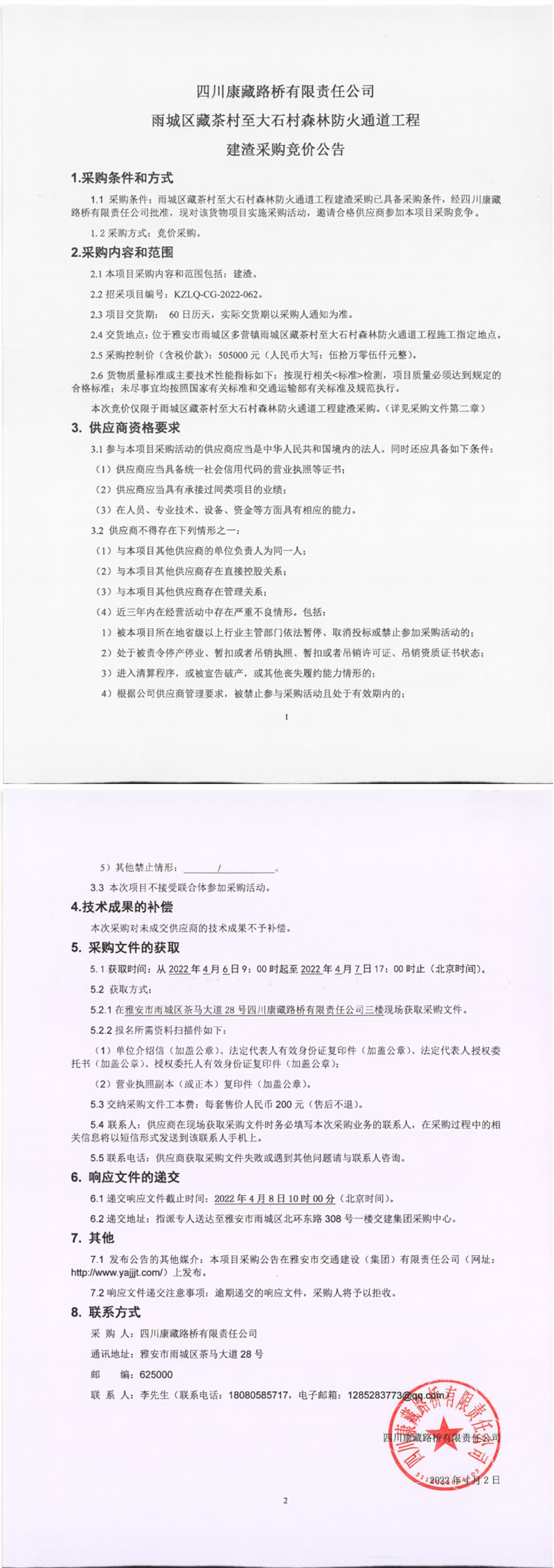 四川康藏路橋有限責(zé)任公司雨城區(qū)藏茶村至大石村森林防火通道工程建渣采購(gòu)競(jìng)價(jià)公告