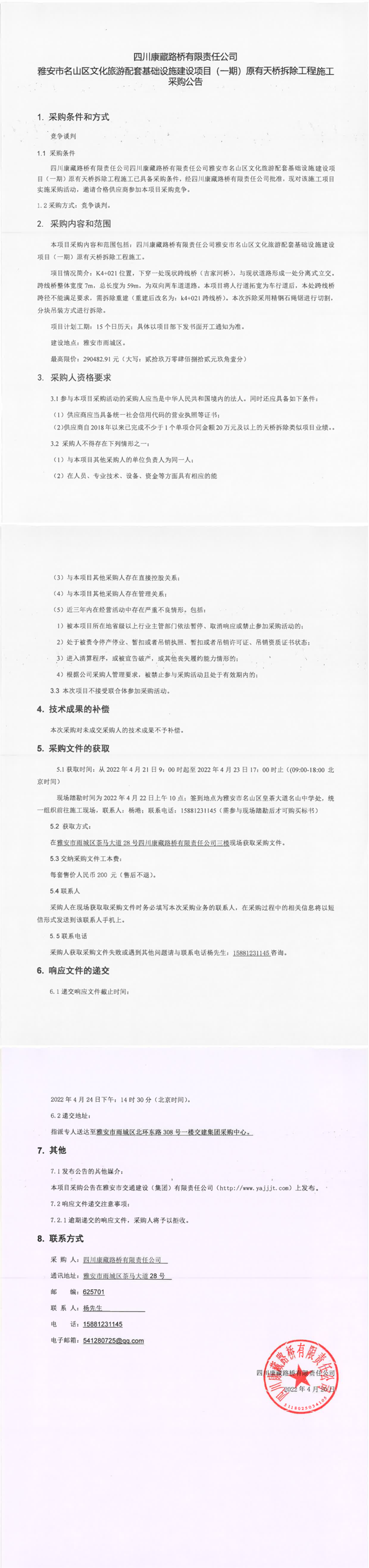 四川康藏路橋有限責(zé)任公司雅安市名山區(qū)文化旅游配套基礎(chǔ)設(shè)施建設(shè)項(xiàng)目(一期)原有天橋拆除工程施工采購(gòu)公告