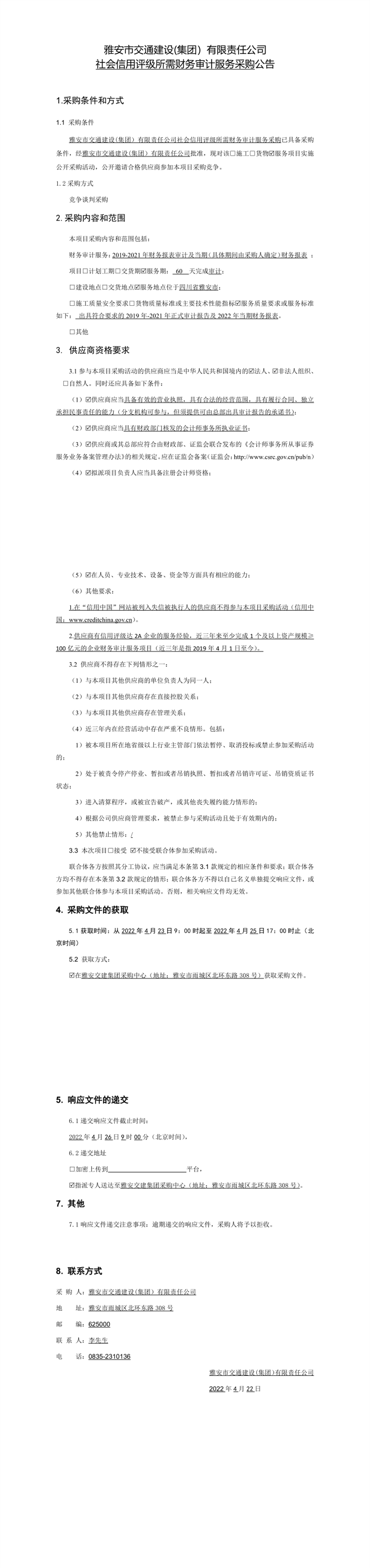 雅安市交通建設(shè)(集團)有限責(zé)任公司社會信用評級所需財務(wù)審計服務(wù)采購公告