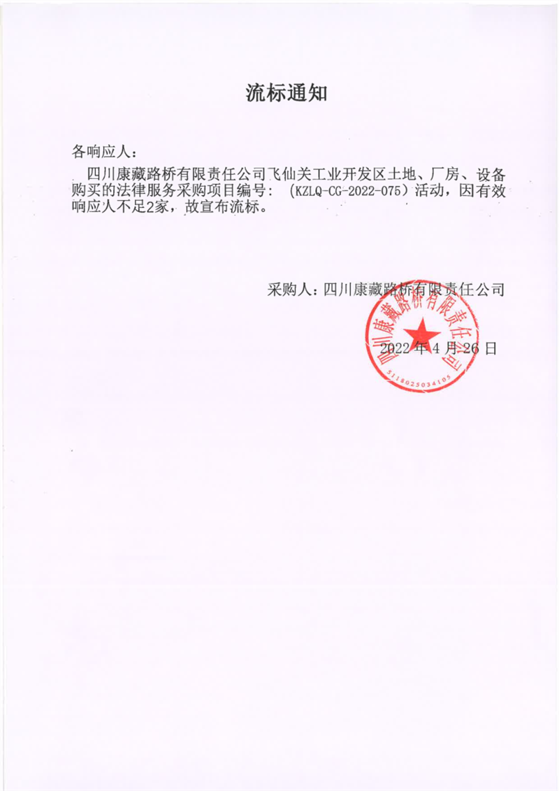 四川康藏路橋有限責(zé)任公司飛仙關(guān)工業(yè)開發(fā)區(qū)土地、廠房、設(shè)備購(gòu)買的法律服務(wù)采購(gòu)項(xiàng)目流標(biāo)通知
