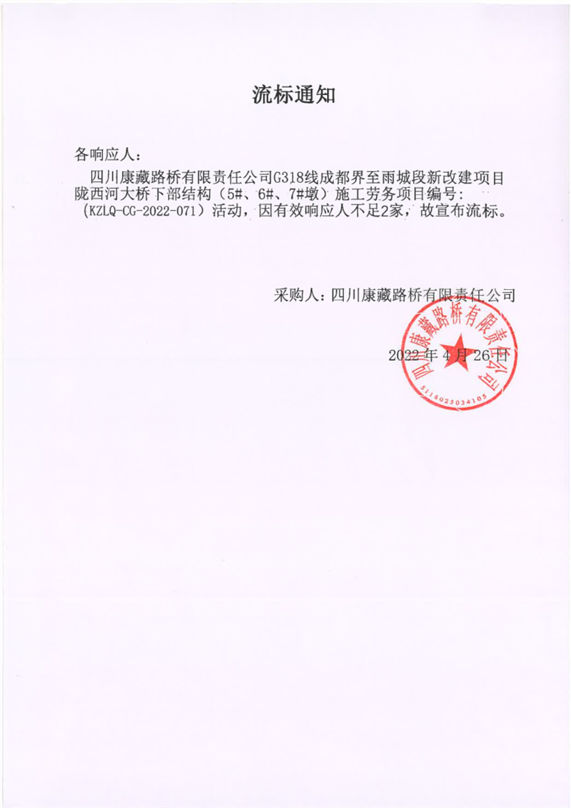 四川康藏路橋有限責(zé)任公司G318線成都界至雨城段新改建項目隴西河大橋下部結(jié)構(gòu)(5#、6#、7#墩)施工勞務(wù)采購流標通知