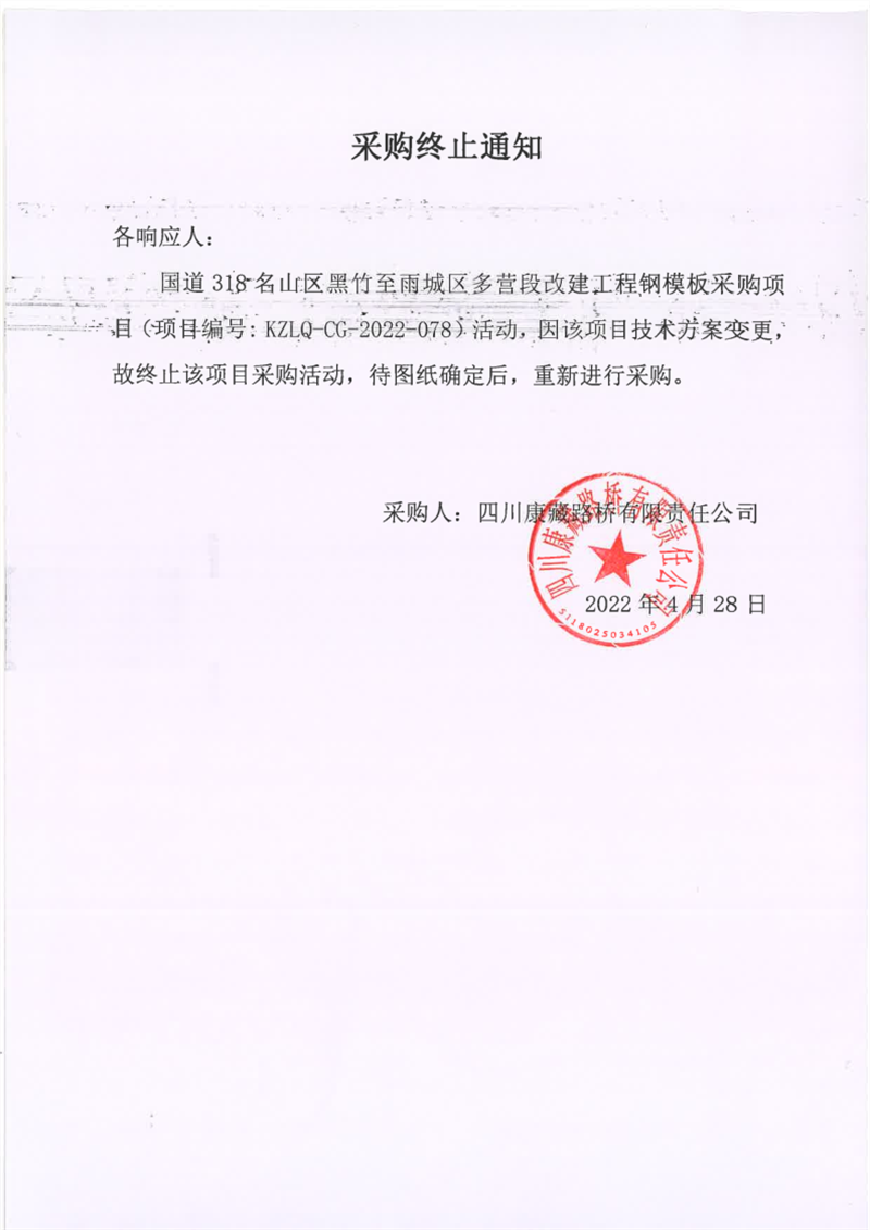 四川康藏路橋有限責(zé)任公司國道318名山區(qū)黑竹至雨城區(qū)多營段改建工程鋼模板采購終止通知