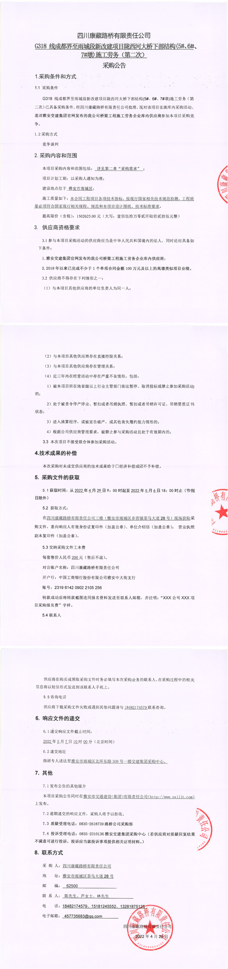 四川康藏路橋有限責任公司G318線成都界至雨城段新改建項目隴西河大橋下部結(jié)構(gòu)(5#、6#、7#墩)施工勞務(第二次)采購公告