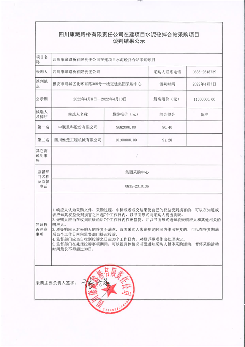 四川康藏路橋有限責(zé)任公司在建項目水泥砼拌合站采購項目談判結(jié)果公示
