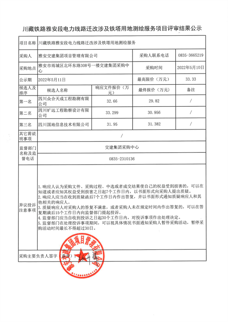 雅安交建集團(tuán)項(xiàng)目管理有限公司川藏鐵路雅安段電力線路遷改涉及鐵塔用地測繪服務(wù)項(xiàng)目評審結(jié)果公示