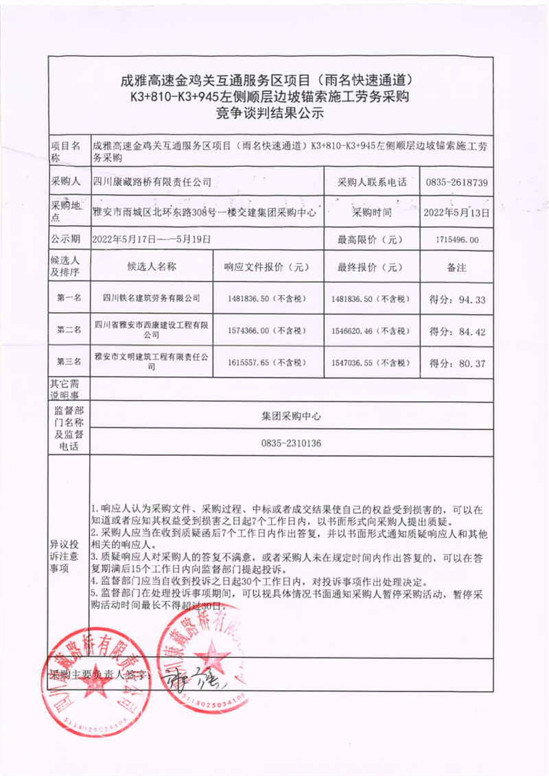 四川康藏路橋有限責(zé)任公司成雅高速金雞關(guān)互通服務(wù)區(qū)項(xiàng)目(雨名快速通道)K3+810-K3+945左側(cè)順層邊坡錨索施工勞務(wù)采購競爭談判結(jié)果公示