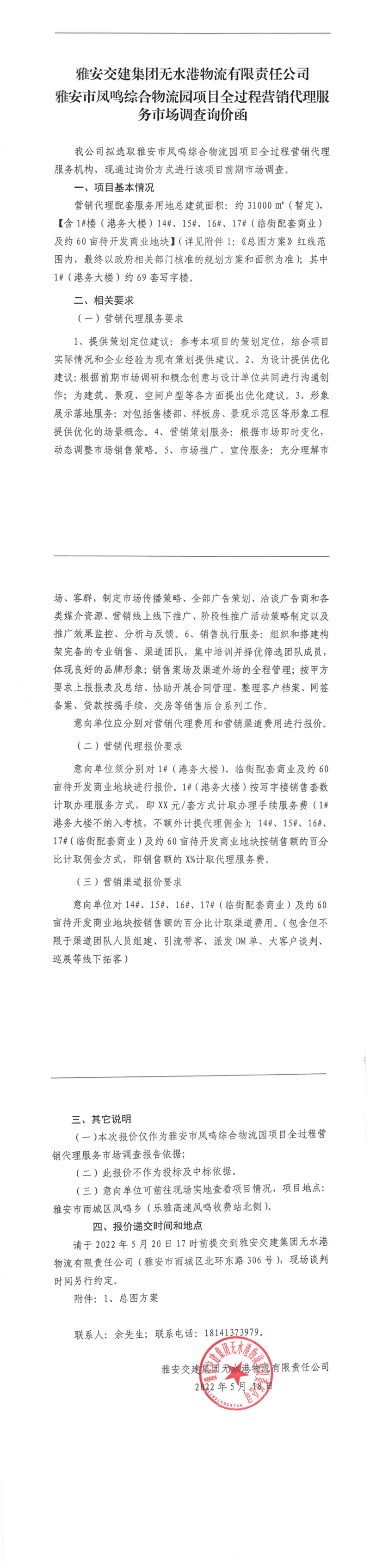 雅安交建集團(tuán)無(wú)水港物流有限責(zé)任公司雅安市鳳鳴綜合物流園項(xiàng)目全過(guò)程營(yíng)銷代理服務(wù)市場(chǎng)調(diào)查詢價(jià)函
