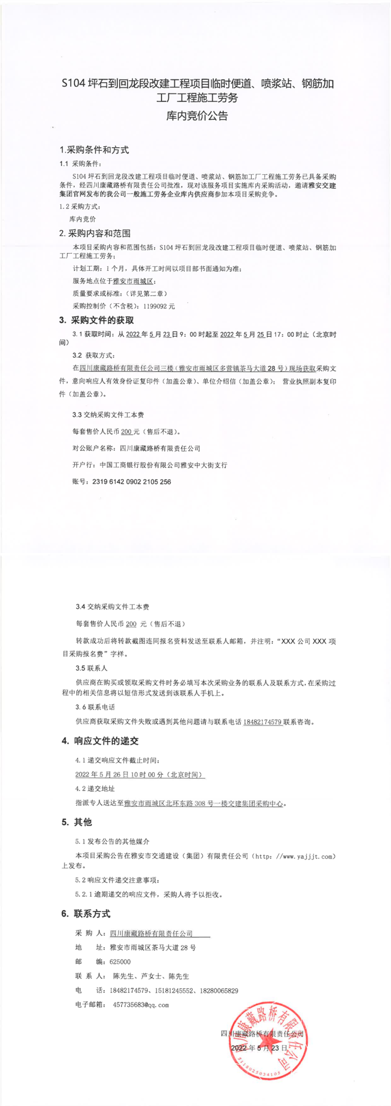 四川康藏路橋有限責(zé)任公司S104坪石到回龍段改建工程項(xiàng)目臨時便道、噴漿站、鋼筋加工廠工程施工勞務(wù)庫內(nèi)競價公告
