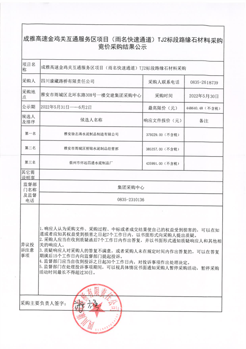 四川康藏路橋有限責(zé)任公司成雅高速金雞關(guān)互通服務(wù)區(qū)項(xiàng)目(雨名快速通道)TJ2標(biāo)段路緣石材料采購(gòu)競(jìng)價(jià)采購(gòu)結(jié)果公示