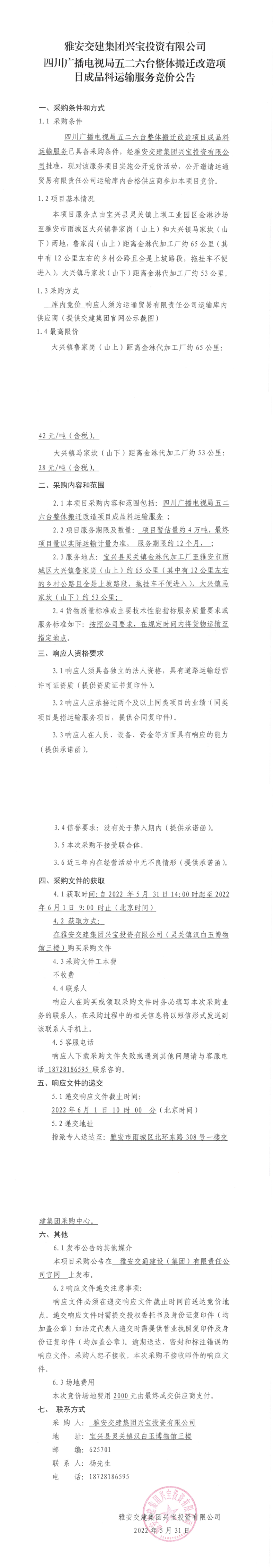 雅安交建集團(tuán)興寶投資有限公司四川廣播電視局五二六臺(tái)整體搬遷改造項(xiàng)目成品料運(yùn)輸服務(wù)競價(jià)公告