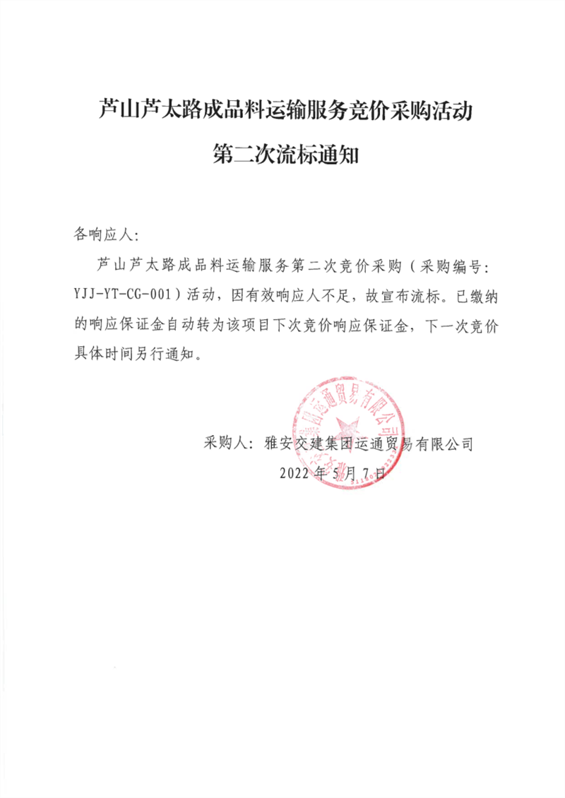 雅安交建集團運通貿(mào)易有限公司蘆山蘆太路成品料運輸服務(wù)競價采購活動第二次流標通知