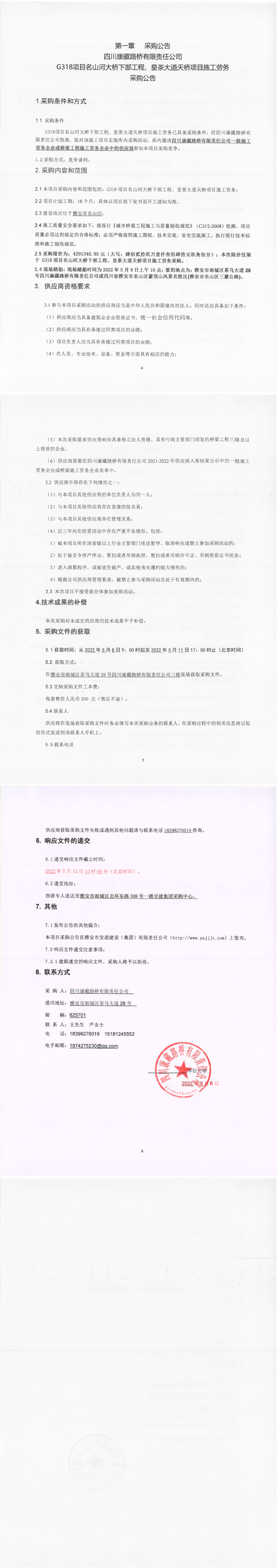 四川康藏路橋有限責(zé)任公司G318項目名山河大橋下部工程、皇茶大道天橋項目施工勞務(wù)采購公告