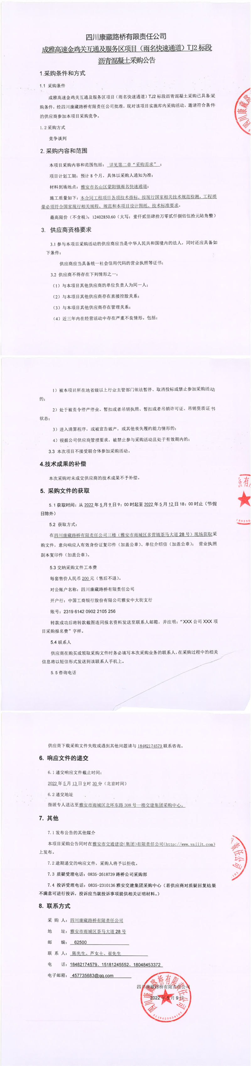 四川康藏路橋有限責任公司成雅高速金雞關(guān)互通及服務(wù)區(qū)項目(雨名快速通道)TJ2標段瀝青混凝土采購公告