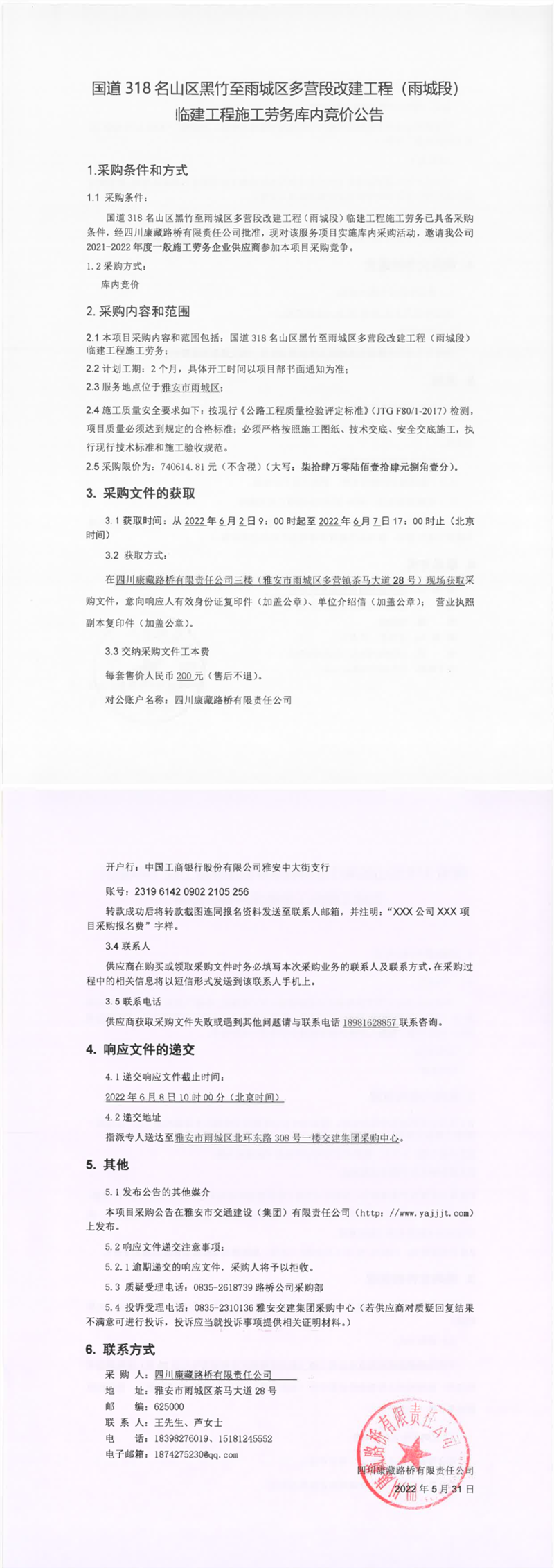 四川康藏路橋有限責(zé)任公司國道318名山區(qū)黑竹至雨城區(qū)多營段改建工程(雨城段)臨建工程施工勞務(wù)庫內(nèi)競價(jià)公告