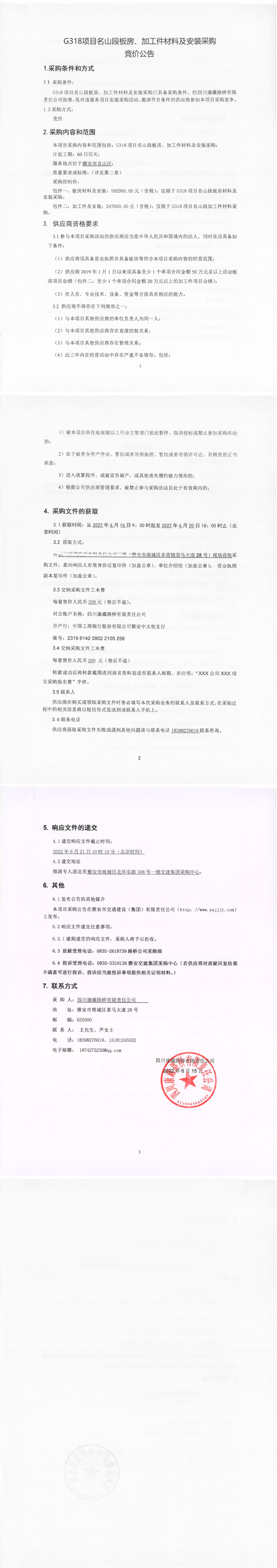 四川康藏路橋有限責(zé)任公司G318項(xiàng)目名山段板房、加工件材料及安裝采購競價公告