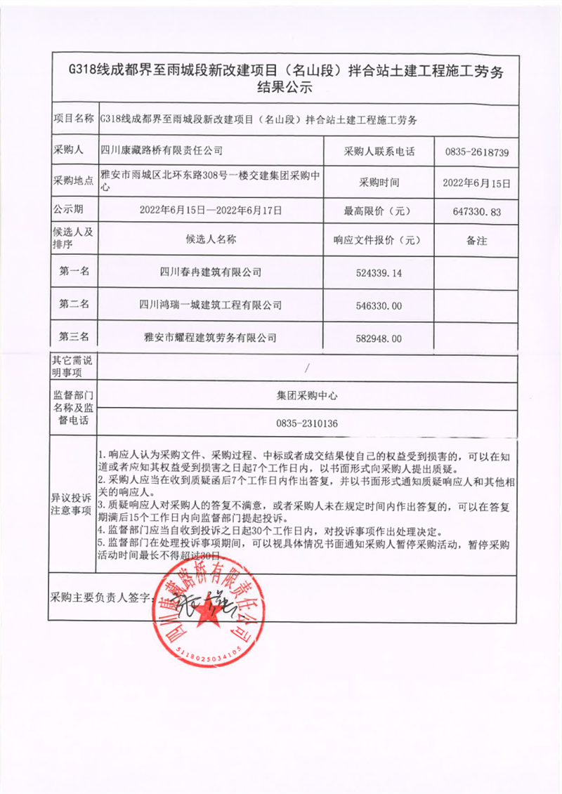 四川康藏路橋有限責(zé)任公司G318線成都界至雨城段新改建項(xiàng)目(名山段)拌合站土建工程施工勞務(wù)結(jié)果公示