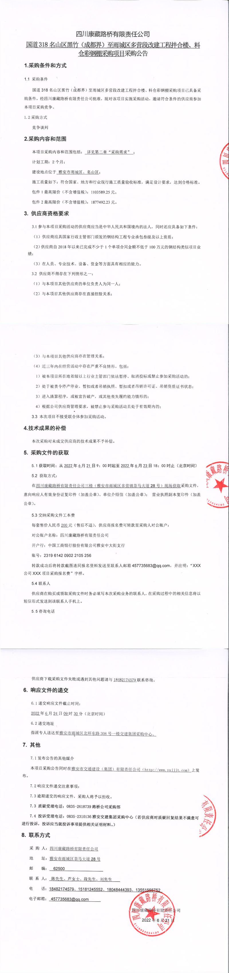 四川康藏路橋有限責(zé)任公司國(guó)道318名山區(qū)黑竹(成都界)至雨城區(qū)多營(yíng)段改建工程拌合樓、料倉(cāng)彩鋼棚采購(gòu)項(xiàng)目采購(gòu)公告