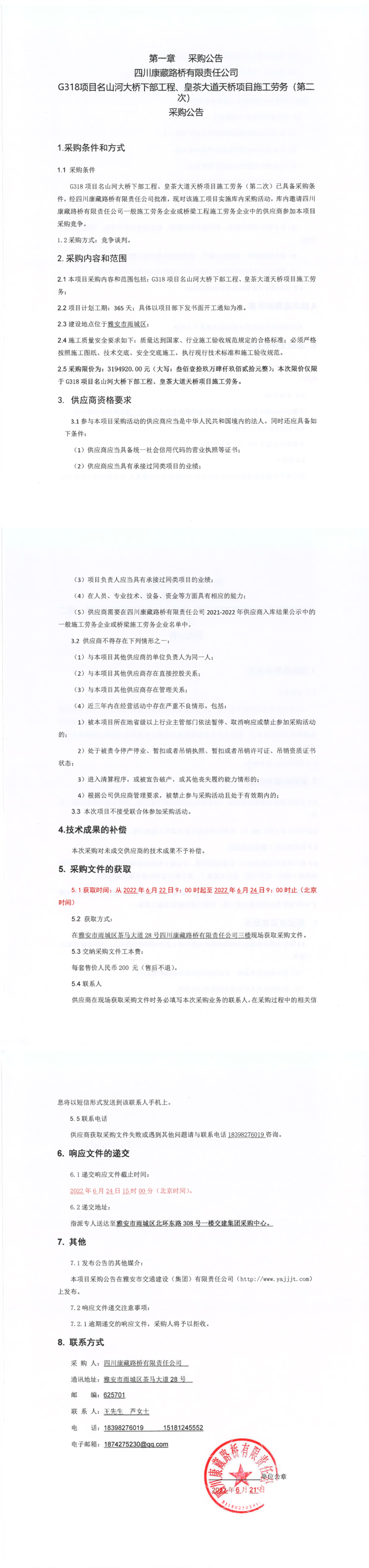 四川康藏路橋有限責(zé)任公司G318項(xiàng)目名山河大橋下部工程、皇茶大道天橋項(xiàng)目施工勞務(wù)(第二次)采購公告