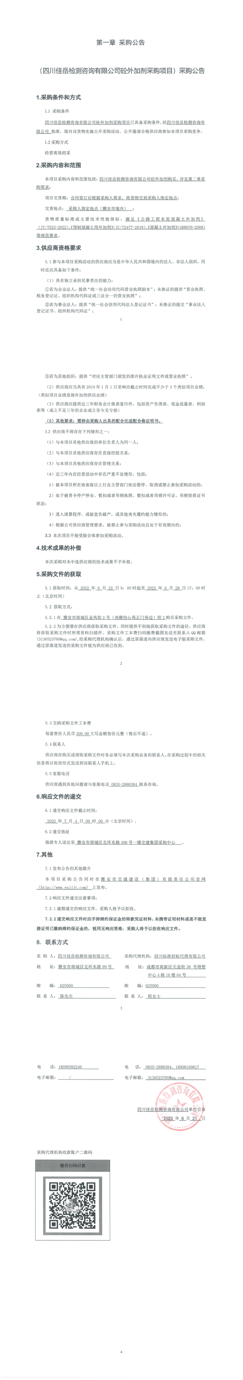 四川佳岳檢測咨詢有限公司砼外加劑采購項目采購公告