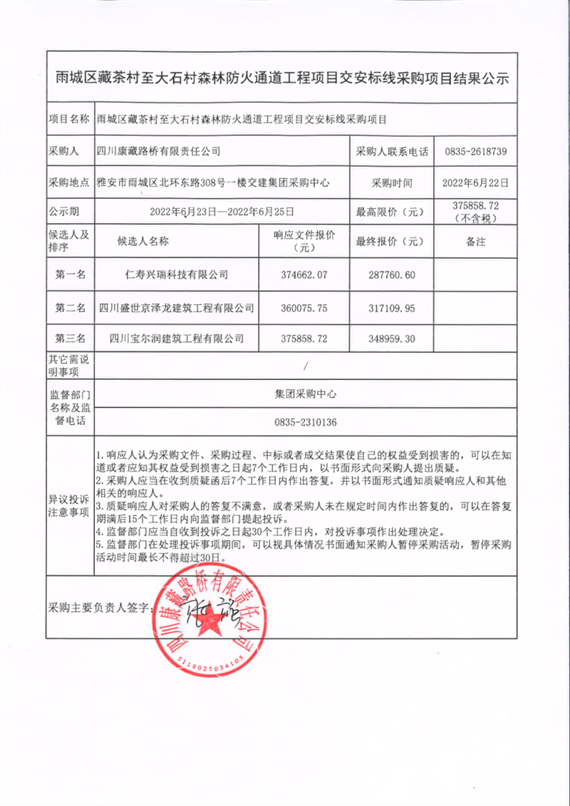 四川康藏路橋有限責(zé)任公司雨城區(qū)藏茶村至大石村森林防火通道工程項目交安標線采購項目結(jié)果公示