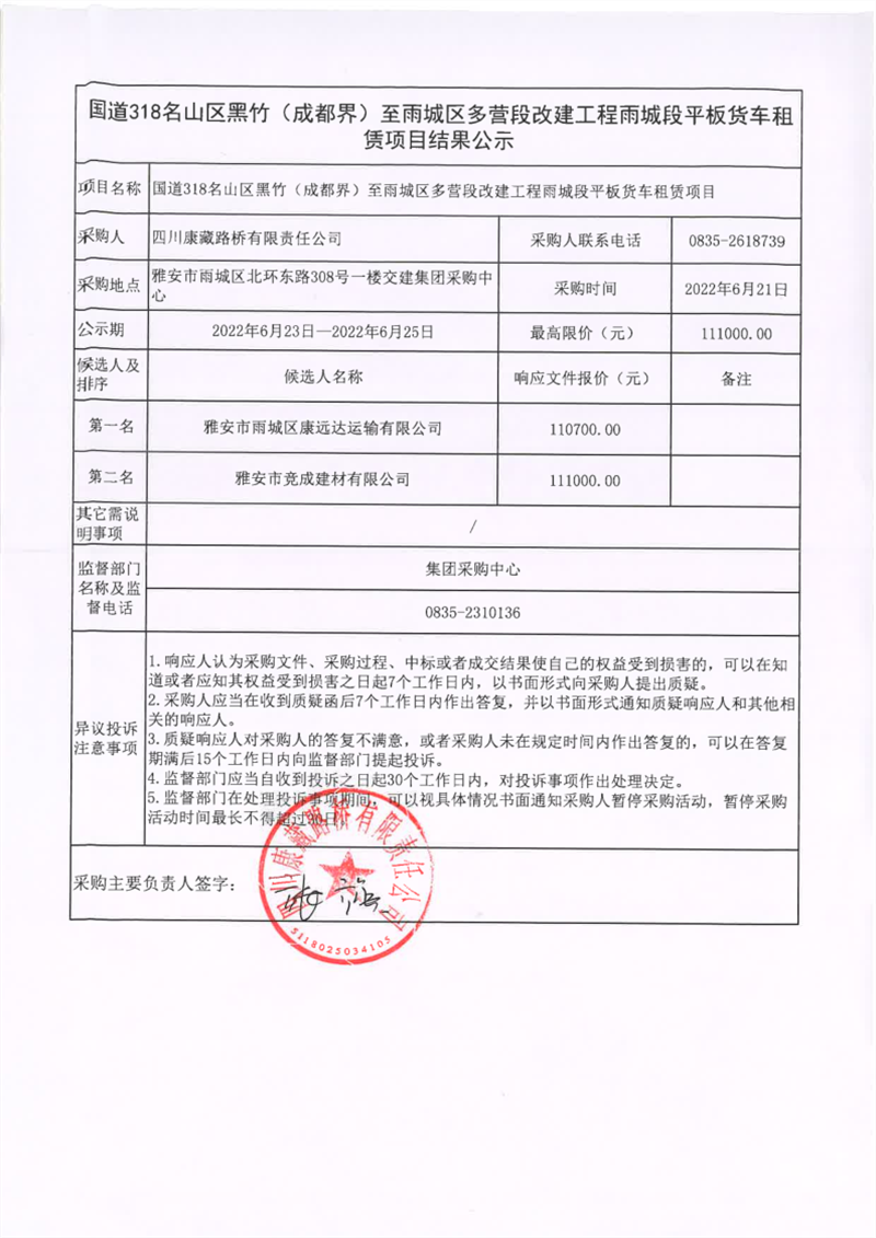 四川康藏路橋有限責任公司國道318名山區(qū)黑竹(成都界)至雨城區(qū)多營段改建工程雨城段平板貨車租賃項目結(jié)果公示