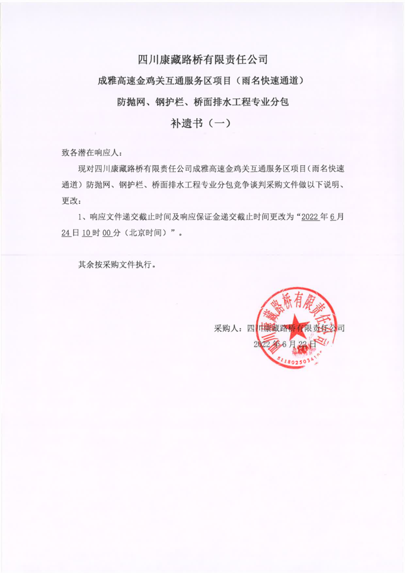 四川康藏路橋有限責(zé)任公司成雅高速金雞關(guān)互通服務(wù)區(qū)項(xiàng)目(雨名快速通道)防拋網(wǎng)、鋼護(hù)欄、橋面排水工程專(zhuān)業(yè)分包補(bǔ)遺書(shū)(一)