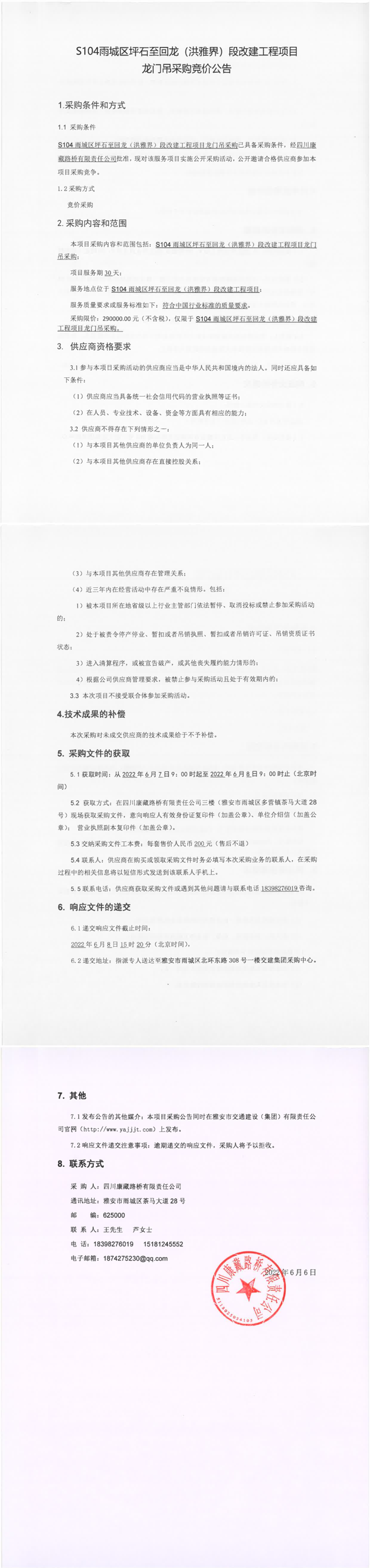 四川康藏路橋有限責(zé)任公司S104雨城區(qū)坪石至回龍(洪雅界)段改建工程項(xiàng)目龍門吊采購競價(jià)公告
