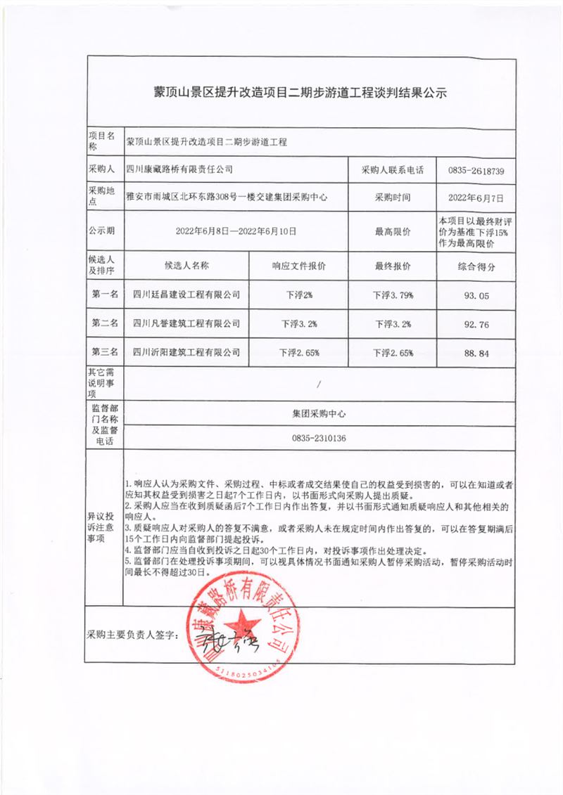 四川康藏路橋有限責(zé)任公司蒙頂山景區(qū)提升改造項目二期步游道工程談判結(jié)果公示