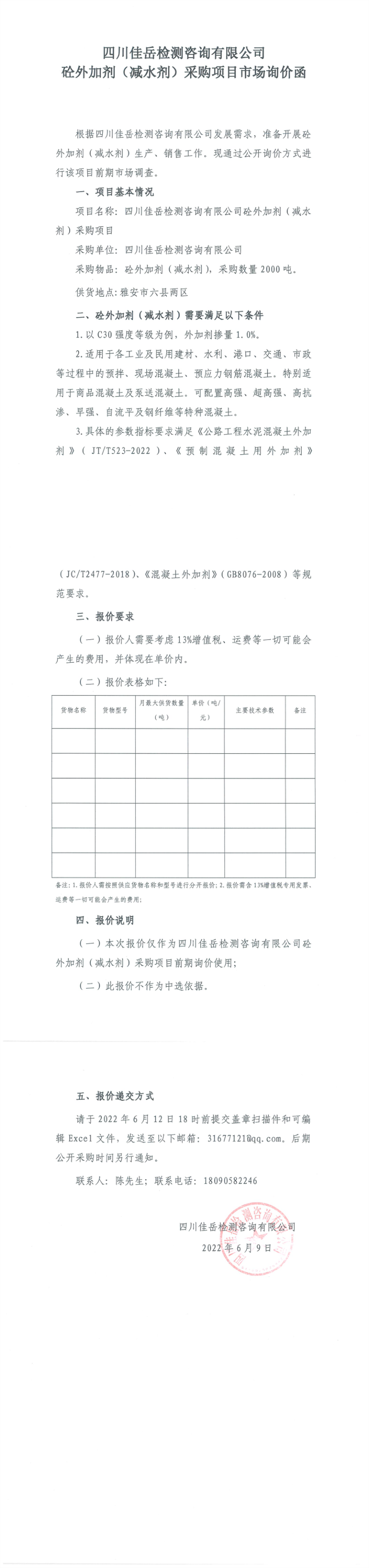 四川佳岳檢測咨詢有限公司砼外加劑(減水劑)采購項目市場詢價函