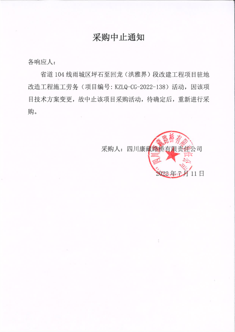 四川康藏路橋有限責(zé)任公司省道104線(xiàn)雨城區(qū)坪石至回龍(洪雅界)段改建工程項(xiàng)目駐地改造工程施工勞務(wù)采購(gòu)中止通知